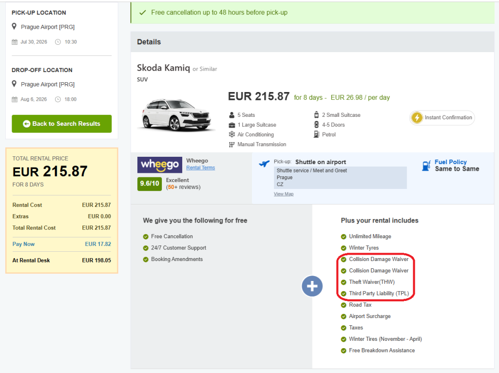 איך זה עובד? אתם זוכרים את סעיף ה-Excess שראינו מקודם? השתתפות עצמית מקסימלית לנזקים, ה-CDW והשתתפות עצמית מקסימלית לגניבה, ה-THW? ראינו שעלינו כשוכרים לשלם עד 1200 אירו במקרים האלה בצ'כיה, עם הביטוח הבסיסי הכלול. צריך להיות מוכנים לשלם אותו ולהרגיש עם זה בנוח, שחברת הביטוח תחזיר את הכסף.