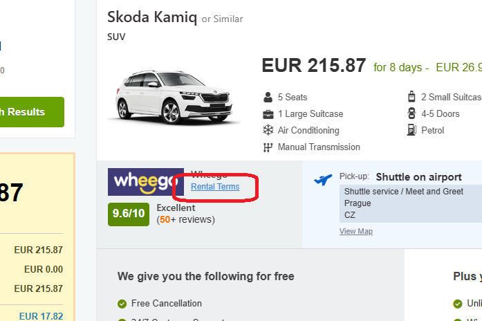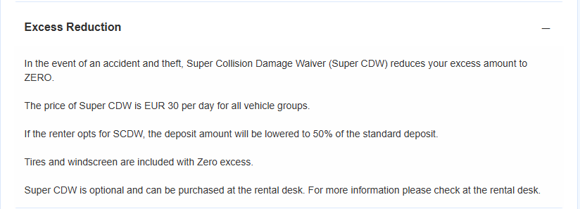 הסעיף השני שכדאי לשים לב אליו הוא Excess Reduction והוא לא תמיד יופיע עם פרטים, אך במקרה של ההצעה שלנו - הוא מפרט שלושה נושאים חשובים: את עלות הביטוח לביטול השתתפות עצמית - כלומר לא לשלם נזקים בכלל בצ'כיה, מול הספק המקומי. כתוב תוספת 30 אירו ליום, לתשלום ישירות מול הספק בדלפק, בעת קבלת הרכב. הפרט השני ויוצא הדופן - הביטוח לביטול השתתפות Super CDW בספק הנ"ל מכסה גם נזקים לצמיגים ולשמשות. ברוב החברות יש צורך בביטוח נפרד למרכיבים הללו ולכן אצל הספק Wheego בצ'כיה - זה בונוס ראוי לציון לטובה. הפרט השלישי - מי שיוסיף את הביטוח הנ"ל בדלפק, יזכה לנעול פקדון מופחת, רק חצי מהפקדון הרגיל (מופיע בהמשך התנאים תחת סעיף Deposit) עם סכום רגיל של כ-1200 עבור רכב קומפקטי ועבור מי שלוקח את הביטוח של הספק - רק 600 אירו.