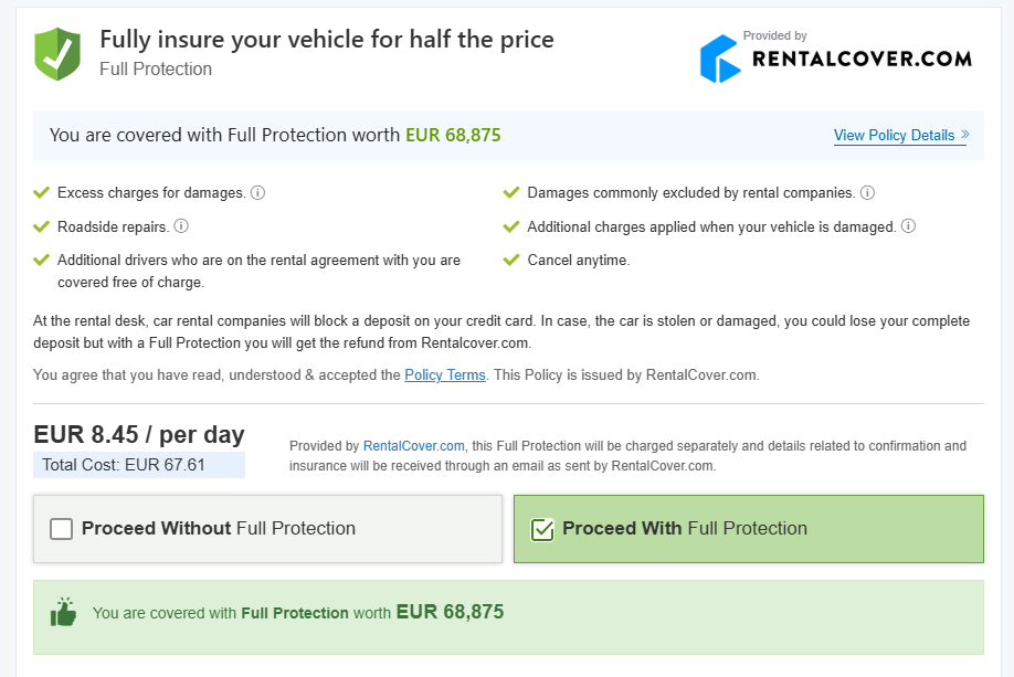 חשוב לוודא שהביטוח שאתם מוסיפים באתר הוא מטעם חברת RentalCover והלוגו שלהם מופיע. למשל כך נראה ביטוח מטעם האתר עצמו, שאינו מגובה בחברת ביטוח: