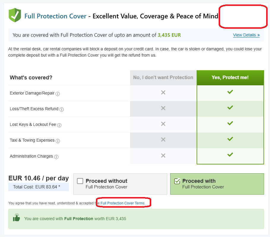 במידה והוספת עשרות אירו ליום עבור ביטוח נשמע לכם לא סביר, אתם צודקים, זה באמת לא סכום סביר. לכן אנו ממליצים לשים לב לסעיף התוספות, שם בחלק התחתון יופיע גם סעיף המאפשר להוסיף ביטוח להחזר השתתפות עצמית בעלות של פחות מ-10 אירו ליום (המחיר משתנה לפי אורך ההשכרה, סוג הרכב וחברת ההשכרה):